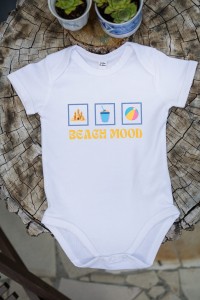 Urocze bawełniane body dla dzieci z wakacyjnym nadrukiem i napisem Beach Mood – idealne na letnie dni pełne słońca i zabawy!