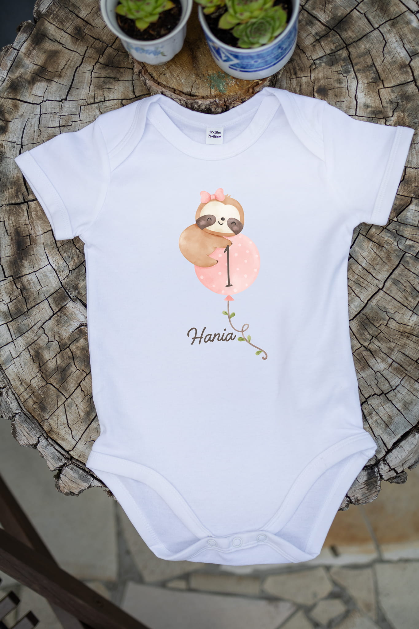 Personalizowana koszulka dziecięca na roczek z nadrukowanym imieniem Twojego dziecka i słodkim leniwcem