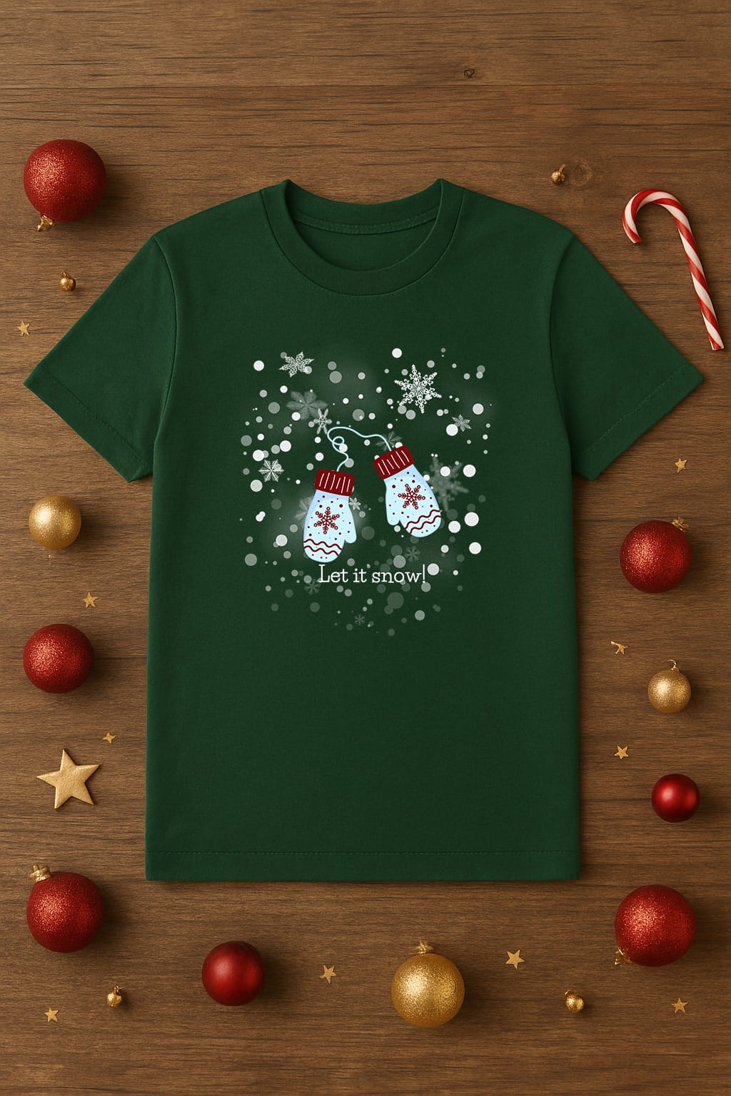 Świąteczna koszulka Let it snow w kolorze butelkowej zieleni z uroczym nadrukiem rękawiczek i płatków śniegu – idealna na zimowe dni i bożonarodzeniowy nastrój.