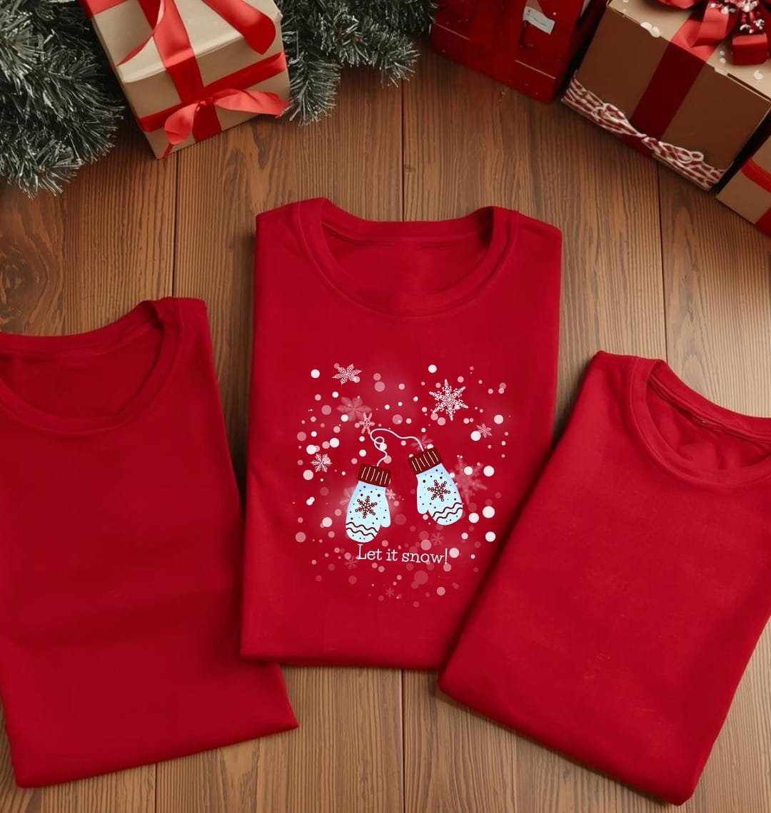 Wprowadź się w zimowy nastrój dzięki wyjątkowej koszulce Let it snow! Uroczy nadruk przedstawiający rękawiczki, płatki śniegu i błyszczące elementy sprawia, że to idealny wybór na grudniowe dni, świąteczne spotkania i rodzinne zdjęcia przy choince.