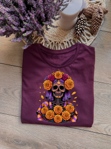 Burgundowa koszulka z pełnokolorową grafiką inspirowaną Día de los Muertos: dekorowana czaszka otoczona nagietkami i detalami w odcieniach fioletu oraz pomarańczu. Autorski projekt MIŁOWEAR, trwały nadruk DTF na miękkiej bawełnie.