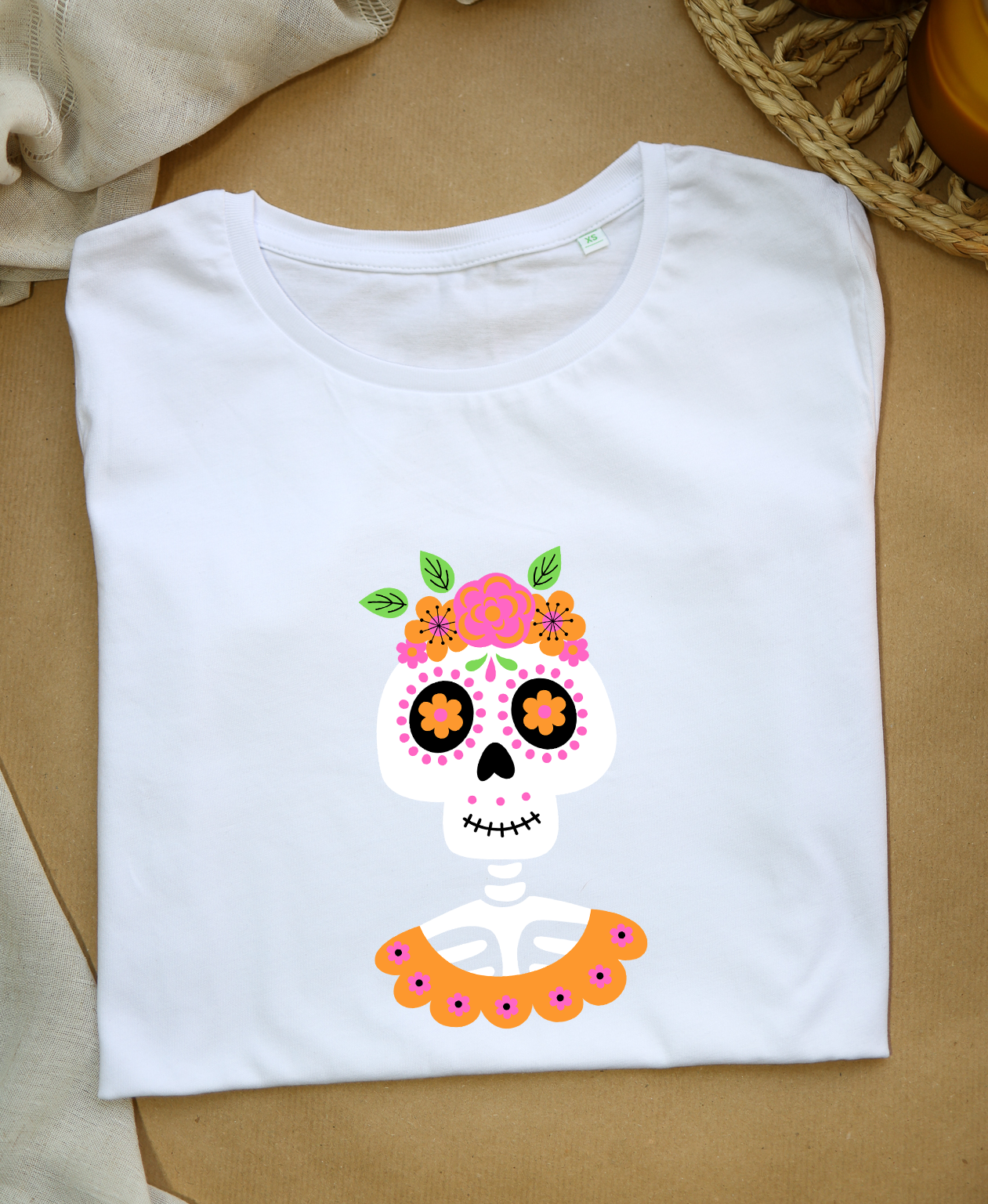 Delikatny, ilustracyjny motyw szkielecika z kwiatową koroną i dekoracyjnym kołnierzem łączy halloweenowy klimat z pastelową, pozytywną estetyką. Biała baza pięknie podbija nasycone odcienie różu, pomarańczu i zieleni, a nadruk DTF pozostaje gładki i wyrazisty po wielu praniach.
