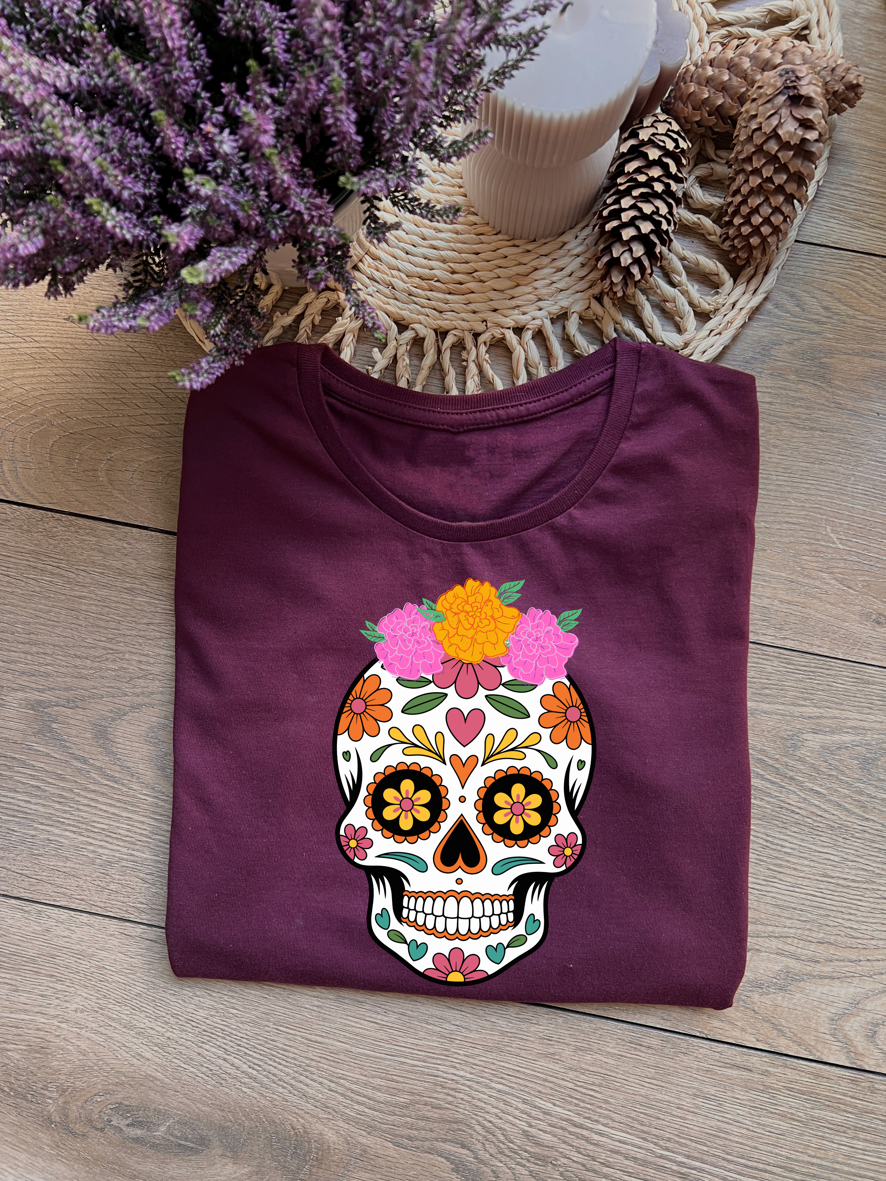 Burgundowa koszulka z kolorową „sugar skull” ozdobioną kwiatami – połączenie halloweenowego klimatu i meksykańskiej estetyki w jednym projekcie. Autorski nadruk DTF na miękkiej bawełnie, idealny na jesienne stylizacje.