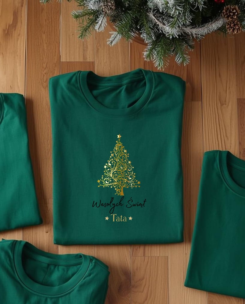 Elegancka koszulka z choinką w złotym wykończeniu i napisem „Wesołych Świąt – Tata”. Miękka bawełna, trwały nadruk DTF z efektem złota – świetna na rodzinne zdjęcia i jako część dopasowanych zestawów.