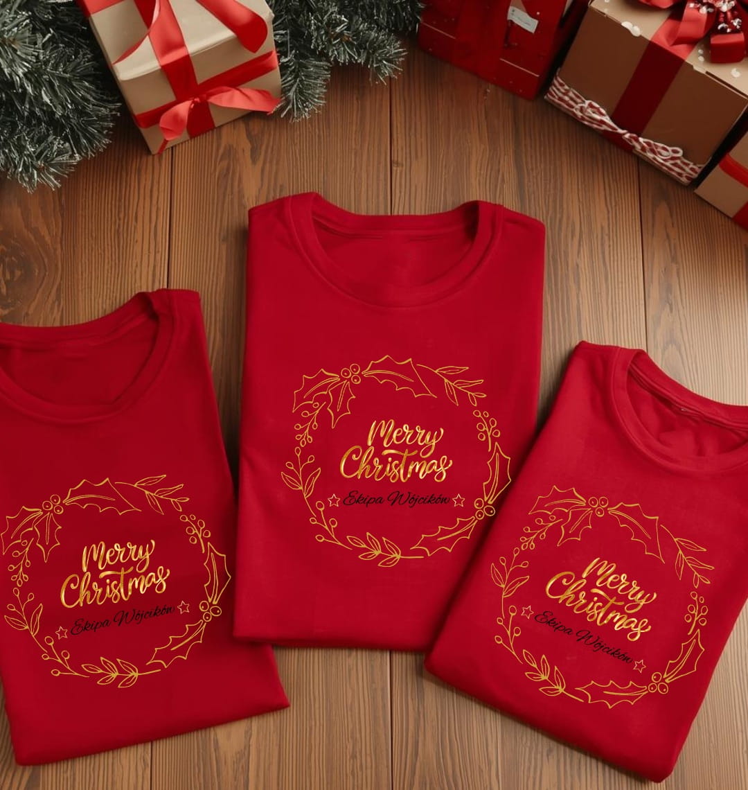Koszulka „Merry Christmas – ekipa Wójcików” – złoty wieniec, rodzinny klimat