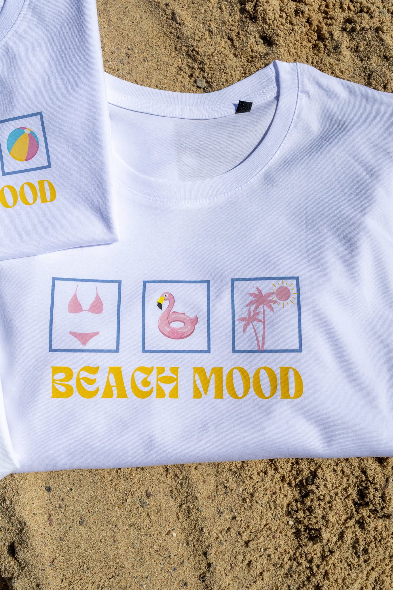 - Stylowy nadruk „Beach Mood” – trwały i odporny na spieranie